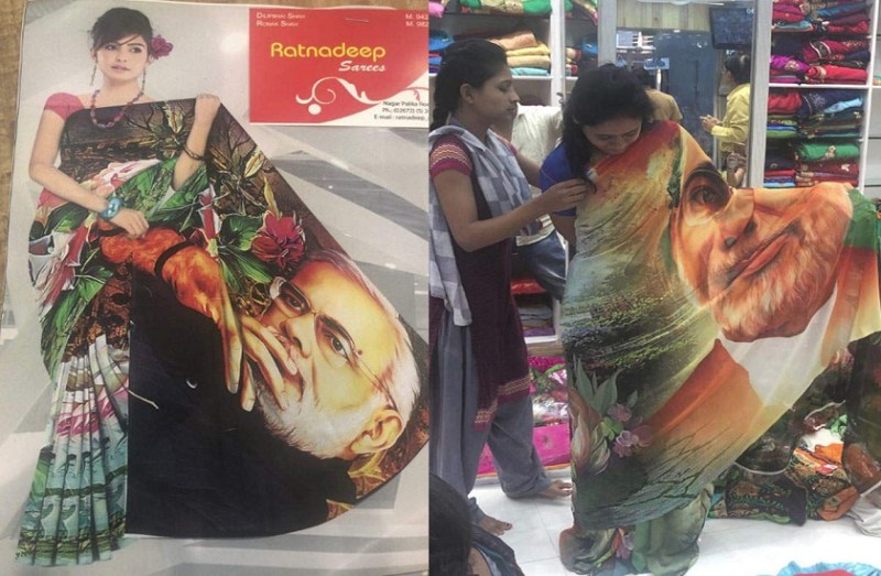 सूरत के बाज़ारों में पीएम मोदी की तस्वीर प्रिंटेड इन साड़ियों की कीमत 280 रुपए से लेकर 1080 रुपए तक बताई जा रही है। इस साड़ी को देखकर लगता है कि 2019 के लोकसभा के चुनावों में व्यापारी भी बढ़-चढ़कर हिस्सा ले रहे हैं। लोकसभा के चुनावों को ही मद्देनज़र रखते हुए गोधरा के कपड़ा व्यापारियों ने बाजार में मोदी साड़ी लॉन्च की है। एक मीडिया चैनल को दिए इंटरव्यू में रौनक शाह नाम के एक साड़ी व्यापारी का कहना है कि, 'हमने नए डिजिटल थीम में भी मार्किट में मोदी साड़ियां लॉन्च की हैं। उनका कहना है कि मोदी प्रिंटेड साड़ियां हमें काफी फायदा पहुंचा रही हैं। इन्हें लॉन्च करने के बाद मार्किट में हलचल सी मच गई है। रौनक शाह ने कहा "हमने मोदीजी की साड़ी लॉन्च की है। साड़ी महिलाओं के बीच पसंदीदा बन गई है। हमने पीएम मोदी की साड़ी की लगभग तीन से चार किस्में बनाई हैं, जिन्हें हम आगे बेचने वाले हैं। आने वाले दिनों में, हम अन्य राजनेता और नेता की थीम वाली साड़ियों को लॉन्च करने की योजना भी बना रहे हैं।"
