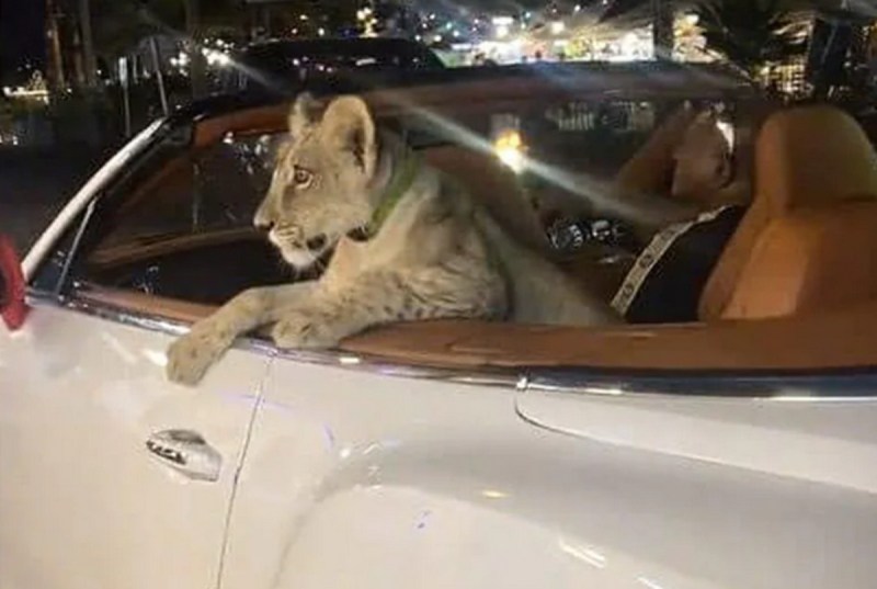 लग्ज़री कार में शेर के बच्चे को बिठाकर घूमा शख्स