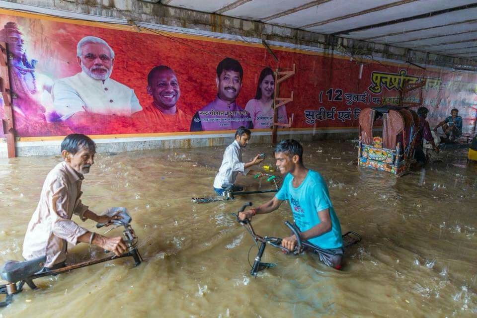 वहीं उत्तर भारत के उत्तर प्रदेश के विभिन्न इलाकों में भी भारी बारिश की वजह से बाढ़ जैसे हालात बने हैं। इन दिनों सोशल मीडिया साइट फेसबुक पर इलाहाबाद के निरंजन डॉट पुल की कुछ फोटो वायरल हो रही हैं। फोटो 12 अगस्त की, इलाहाबाद के एक अंडरपास की हैं। जहां भारी बारिश के बाद काफी पानी इकट्ठा हो गया है। आलम ये था कि अंडरपास में साढ़े तीन से लेकर चार फीट तक पानी इकट्ठा हो गया। लेकिन खास बात ये है कि इसी अंडरपास में बीजेपी की एक होर्डिंग भी लगी है, जिसमें पीएम मोदी के अलावा यूपी के सीएम योगी आदित्यनाथ भी नज़र आ रहे हैं। दरअसल ये होर्डिंग नन्द गोपाल गुप्ता "नंदी" ने लगवाई थी, जिसमें उनकी पत्नी अभिलाषा गुप्ता की भी तस्वीर है।