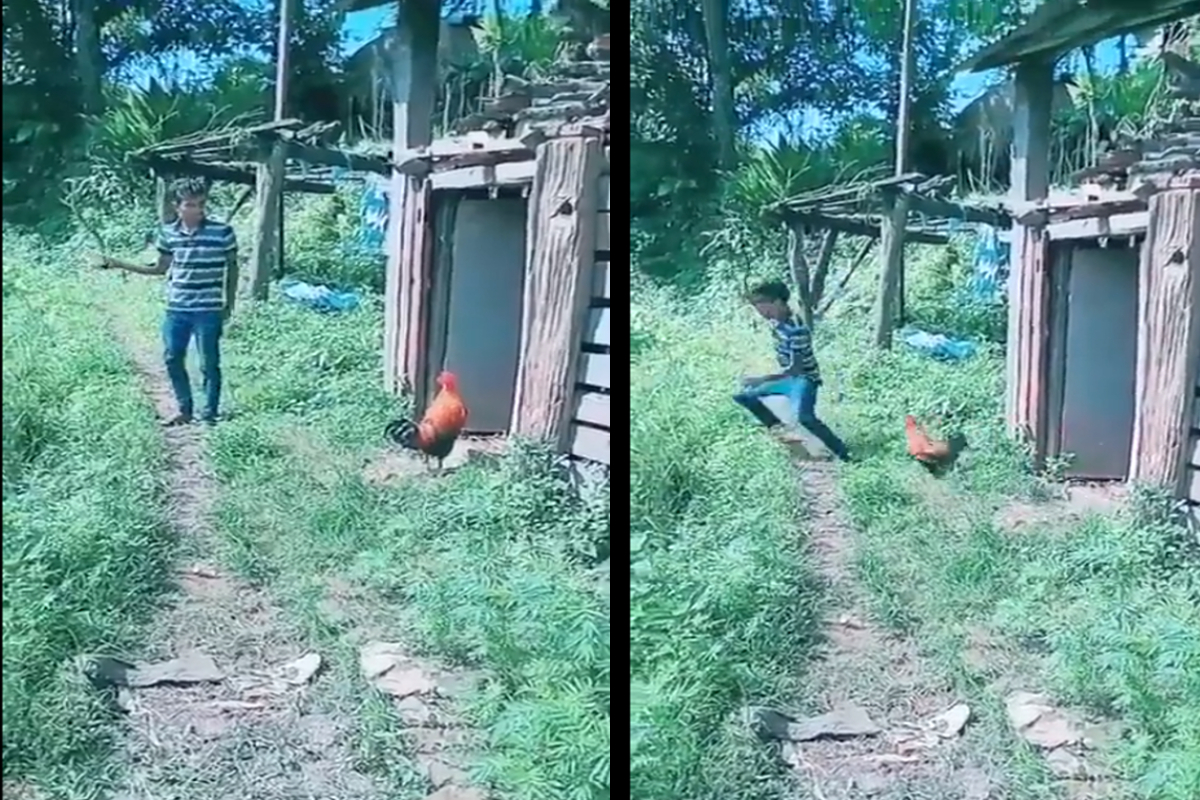 वायरल वीडियो में देख सकते है कि किसी जंगल के आस पास का दृश्य है। पास में एक लकड़ी की झोपड़ी बनी हुई है। उसके दरवाजे पर एक मुर्गा खड़ा है। वहीं एक लड़का भी खड़ा नजर आ रहा है। लड़के के हाथ में एक लकड़ी की मदद से मुर्गे को डराने की कोशिश कर रहा है। हालांकि युवक को बिल्कुल भी इस बात का अंदाजा नहीं होगा कि आगे उसके साथ होने वाला है।