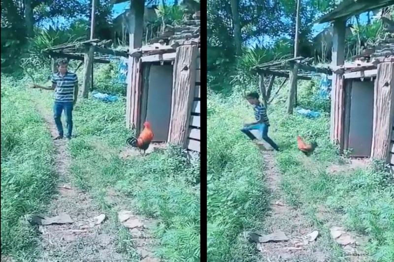 लड़के ने मुर्गे को लकड़ी से डराया तो पहले तो मुर्गा देखता रहा। जानवर ने डिफेंस में कुछ ऐसा किया जिसको देखकर लड़के को वहां से भागना पड़ा। अचानक मुर्गे ने लड़के पर हमला कर दिया। इसके बाद लड़का डरकर भागने लगा और एक पेड़ में गिर गया। पेड़ से टकराकर वह लड़का नीचे की तरफ एक छोटी सी खाईनुमा जगह में गिर जाता है। हालांकि गनीमत रही कि लड़के को कोई चोट नहीं आई। युवक मुर्गे के हमले से बुरी तरह डर गया था।