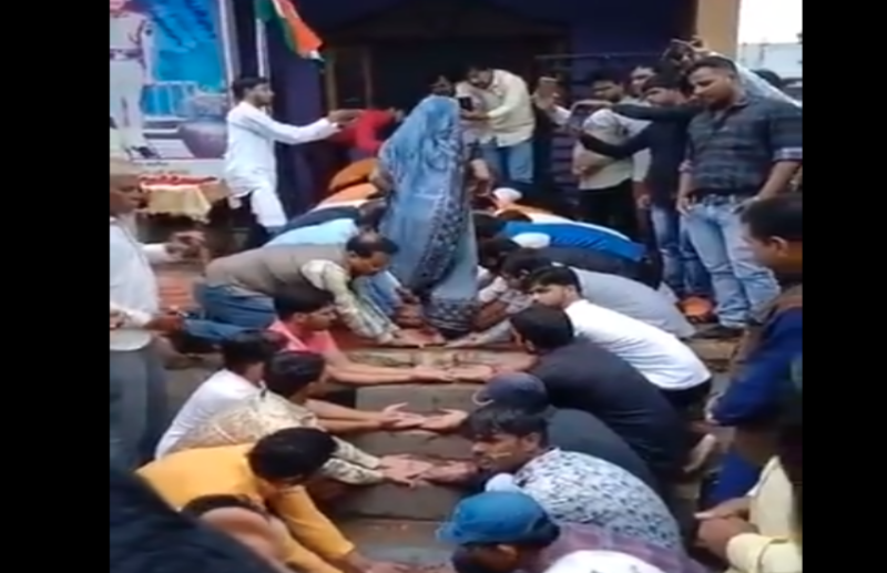 वीडियो में देखा जा सकता है कि कई युवाओं ने अपनी हथेली शहीद की बेवा के लिए जमीन पर बिछा दिए। जिसके बाद उस पर चलकर शहीद की पत्नी ने अपने नए घऱ में प्रवेश किया। देखें वीडियो-
