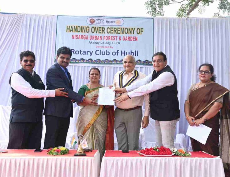 शहर के तोलनकेरे के पास अक्षय कॉलोनी में क्लब के तत्वावधान में स्थापित निसर्ग नगर वन और उद्यान शहरी जीवन के लिए आवश्यक हरित वातावरण प्रदान कर रहा है। यहां मियावाकी वन, भारतीय मूल वृक्ष पार्क, सुश्रूत वान-हर्बल गार्डन, लीजर पार्क सहित उद्यान विकसित किया गया है। इसमें 55 हजार पौधों को उगाया गया है। ऐसी कई विशेषताओं वाला एक खूबसूरत प्राकृतिक शहरी जंगल और उद्यान हुब्बल्ली धारवाड़ महानगर निगम को सौंपा गया। महापौर वीणा बरदवाड़ एवं महानगर निगम आयुक्त डॉ. ईश्वर उल्लागड्डी ने रोटरी क्लब के अध्यक्ष अरविंद कुबसद, सामुदायिक सेवा निदेशक सुरेंद्र पोरवाल और कार्यक्रम अध्यक्ष बी.बी. पाटिल से हस्तांतरण पत्र स्वीकार किया। महानगर निगम आयुक्त डॉ. ईश्वर उल्लागड्डी ने कहा कि रोटरी क्लब की ओर से विकसित उद्यान दूसरों के लिए एक मॉडल है। शहर के अन्य उद्यानों को भी इसी प्रकार विकसित करने पर ध्यान दिया जाएगा। महानगर निगम की ओर से एसटीपी प्लांट में अच्छा वातावरण विकसित किया जा रहा है। उद्यानों को मियावाकी वन की तरह विकसित किया जाएगा।