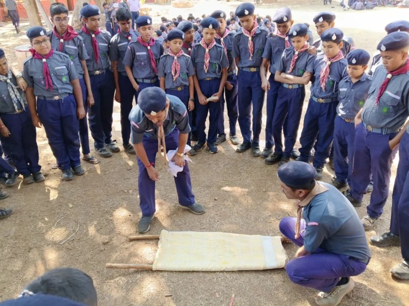 आपदा में सेवा का संकल्प: प्राथमिक उपचार और सुरक्षित तरीके से घायलों को अस्पताल पहुंचाने का अभ्यास करते स्काउट-गाइड सदस्य।