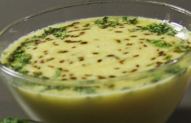 अब इसमें तड़का लगाएं, इसके लिए पैन में तेल डालकर गर्म कीजिए, तेल गरम होने पर इसमें जीरा और हींग डाल कर थोडा़ सा भून लें और तड़के को महेरी के ऊपर डालकर मिक्स कर दीजिए। ऊपर से हरा धनिया डाल कर सजाइए।