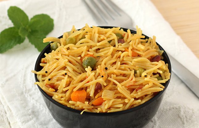 एक पैन में हल्का सा घी या तेल डालकर थोड़ी सी राई डालें। इसके चटकते ही दो कढ़ी पत्ते और तुरंत प्याज डालें। हल्का भूरा होने तक प्याज को सेकें। इसमें सब्जियां भी डाल सकते हैं। इसके बाद कटी शिमला मिर्च डालें। 5-10 मिनट बाद इसमें स्वाद के अनुसार नमक, पिसी लाल मिर्च और कटी हरी मिर्च डालें। मिक्स होने के बाद जितनी सेवईयां हैं उससे दोगुना पानी इसमें डालें। पानी अच्छे से गर्म होने के बाद इसमें सिकी हुई सेवईयों को मिक्स कर दें। 4-5 मिनट के लिए इसे ढक कर रख दें ताकि यह स्टीम में पक जाए। इसे गर्मागर्म सर्व करें।