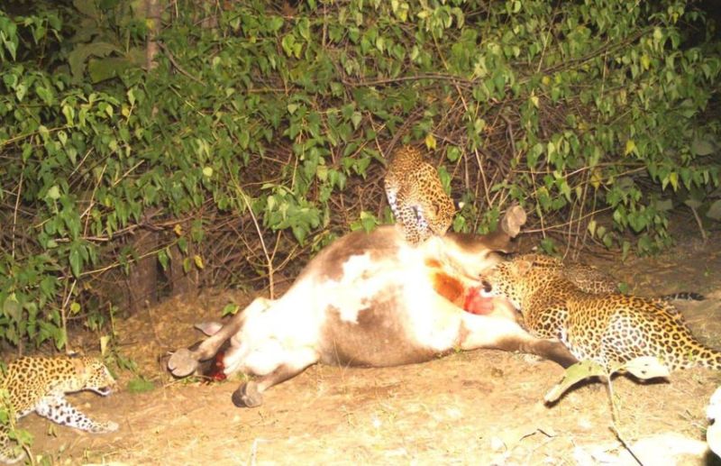 इंदौर. जिले के झिकारियाखेड़ी गांव के जंगल में तेंदुओ ने मिलकर एक गाय का शिकार किया है। वन विभाग की टीम ने मौके पर पहुंचकर जांच-पड़ताल की है। वन विभाग के मुताबिक मांगलिया बीट के कक्ष क्रमांक 75 में तीन तेंदुओं ने मिलकर एक गाय को अपना शिकार बनाया है। इंदौर. वन विभाग की पड़ताल में पता चला है कि यह गाय ग्राम झिकारियाखेड़ी बढिय़ा के निवासी पवन पिता शिवरतन की है।