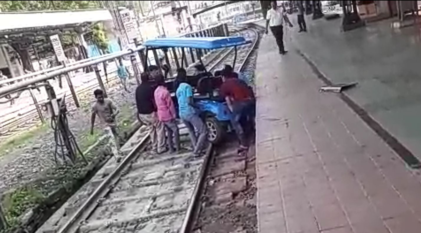 प्लेटफार्म नंबर दो पर तेजी से दौड़ रही बैटरी कार सीधे रेलवे पटरियों पर ही जा गिरी