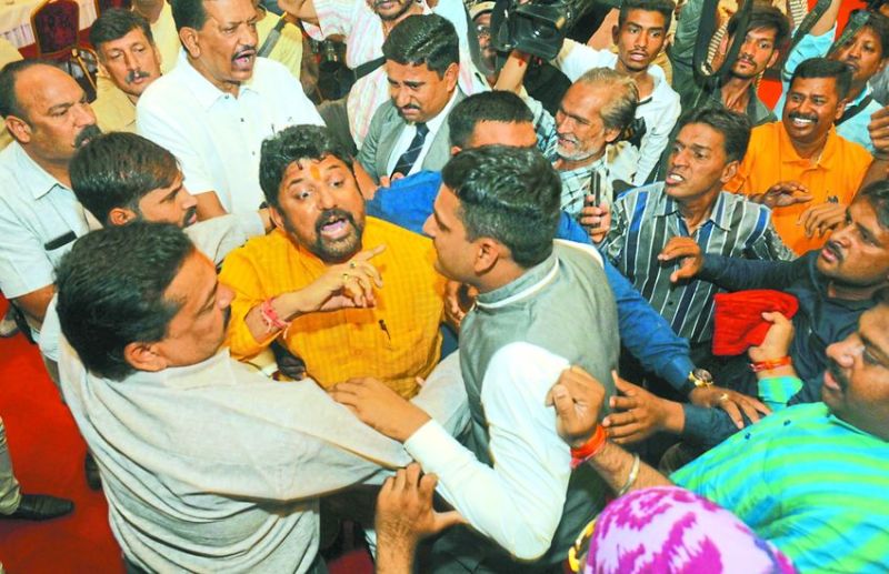 इंदौर. नगर निगम की बजट परिषद की बैठक में गुरुवार को जमकर हंगामा हुआ। ब्रिलियंट कन्वेंशन सेंटर में बजट पर चर्चा शुरू होने से पहले ही बाहर टेंट लगाकर पानी की समस्या को लेकर प्रदर्शन कर रहे कांग्रेसी नेता अचानक अंदर घुस गए और नारेबाजी करने लगे। एमआईसी सदस्य सुधीर देडग़े उन्हें समझाने पहुंचे। देडग़े के साथ भीड़ ने कॉलर पकडक़र झूमाझटकी की और उन्हें चांटा मार दिया। मामला थाने तक पहुंच गया।