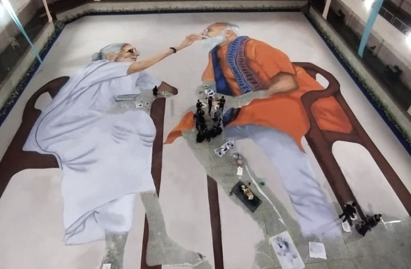 पीएम नरेंद्र मोदी के जन्मदिन पर इंदौर में एक अनूठा कार्य भी हुआ है. मोदी के 71वें जन्मदिवस के मौके पर यहां 7100 स्क्वॉयर फीट की रंगोली बनाई जा रही है. इंदौर की सांस्कृतिक संस्था नमो नमो शंकरा द्वारा यह विशाल रंगोली उकेरी गई है। इस विशाल रंगोली में पीएम नरेंद्र मोदी के साथ उनकी मां हीराबेन भी हैं. रंगोली में मां हीराबेन उन्हें मिठाई खिलाते हुए नजर आ रही हैं।