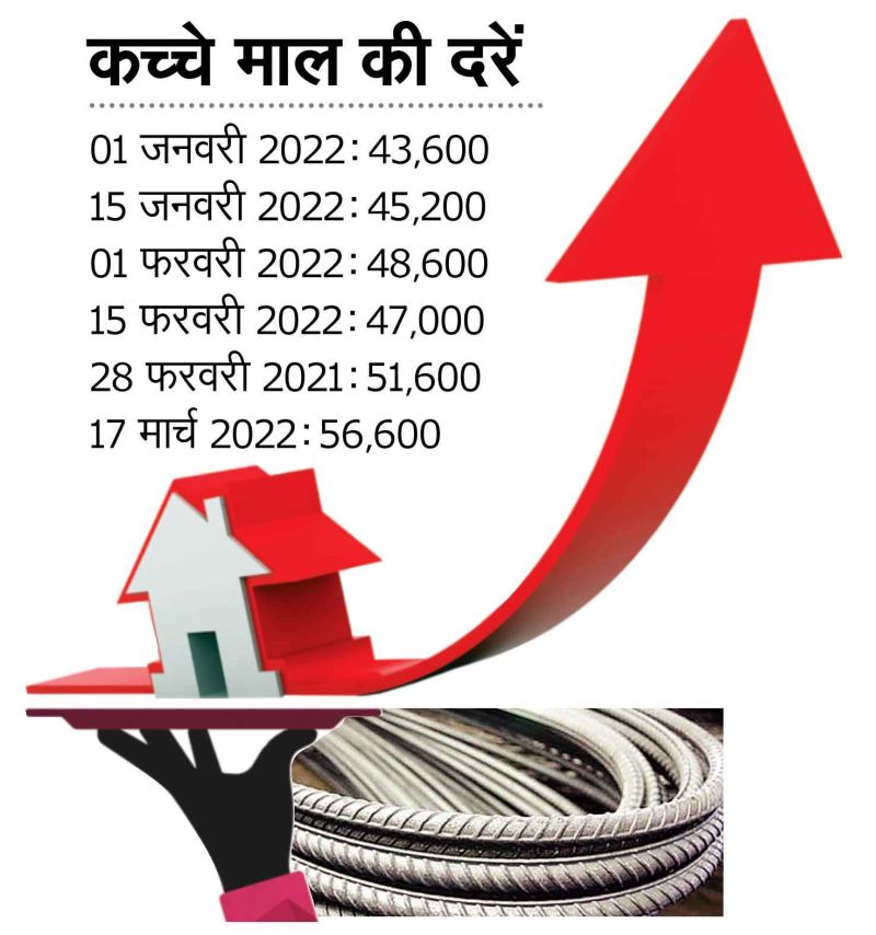 लोहे का कारोबार करने वाले अंकित सक्सेरिया के मुताबिक लोहे के कच्चे माल (बिलेट) की कीमतेें साढ़े तीन महीने में करीब 40 फीसदी तक बढ़ गई है। एक दिसंबर 2021 को लोहे की प्रति मेट्रिक टन (प्रति हजार किलो) कीमत 43,600 रुपए थी, जो बढ़कर 56,600 रुपए पहुंच गई है। पिछले 17 दिनों दामों में तेजी से बढ़ोतरी हुई है। 28 फरवरी को कीमत 51,600 रुपए थी जो 17 मार्च को 56 हजार 600 रुपए तक पहुंच गई है। रूस और यूक्रेन के बीच चल रहे युद्ध के चलते शेयर बाजार के उतार-चढ़ाव को भी कीमतें बढ़ने की वजह माना जा रहा है।