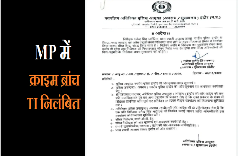 इंदौर। आखिरकार इंदौर क्राइम ब्रांच (indore crime branch) TI धनेंद्र सिंह भदौरिया को निलंबित (Indore Crime Branch TI suspended) कर दिया गया है आज यानि रविवार सुबह इसका आदेश जारी कर दिया गया, अतिरिक्त पुलिस आयुक्त राजेश हिगणकर ने यह आदेश जारी किया है इस आदेश में लिखा गया है कि धनेद्र सिंह भदौरिया थाना प्रभारी अपराध शाखा (TI indore crime branch) नगरीय पुलिस इंदौर के विरुद्ध अभद्र व्यवहार एवं अवैध वसूली संबंधी शिकायतें प्राप्त होने के संबंध में तत्काल प्रभाव से निलंबित किया जाता है, इन्हें रक्षित केंद्र संबंद्ध किया जाता है।