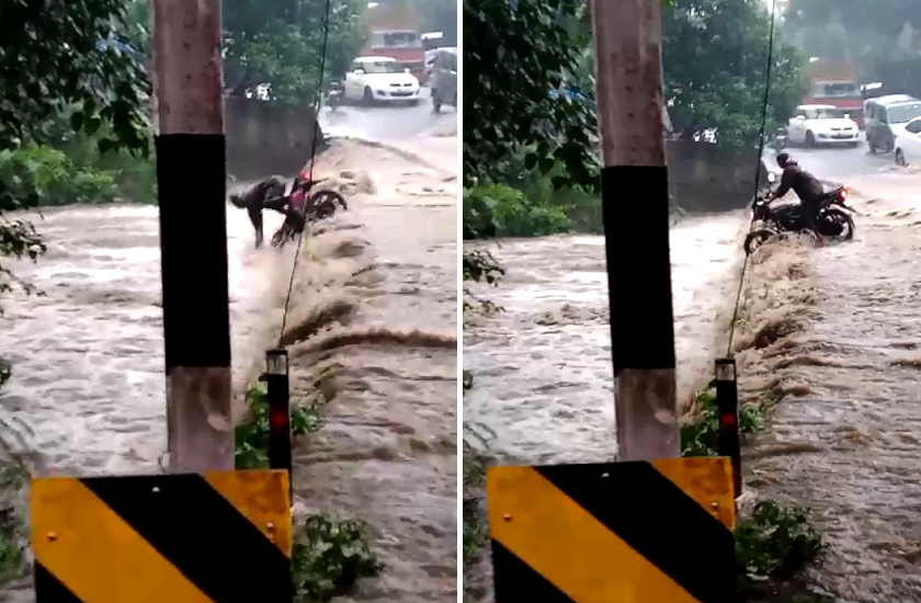 लापरवाही पड़ी जान पर भारी, बाइक समेत नदी के तेज बहाव में बह गया युवक, देखें Live Video