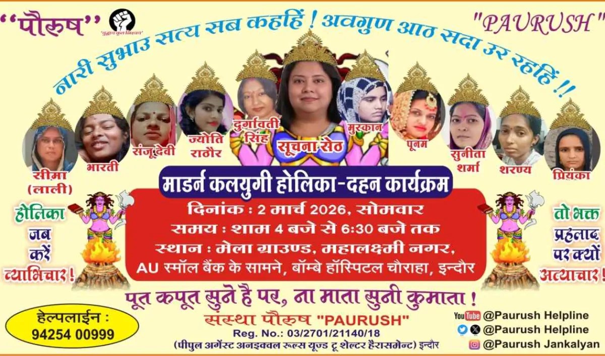 Holi- होली का महापर्व पास आ चुका है। देश-दुनिया की तरह एमपी में भी 3 मार्च को होली मचाई जाएगी। इससे पूर्व 2 मार्च की रात को होलिका दहन होगा। इस मौके पर इंदौर में अनोखा कार्यक्रम आयोजित किया जा रहा है। यहां होलिका दहन के रूप में ऐसी महिलाओं का पुतला जलाया जाएगा जिनपर अपनी ही संतान को मार डालने के आरोप हैं। इसे ‘मॉडर्न हत्यारी होलिका दहन’ का नाम दिया गया है। यह अनोखा होलिका दहन कार्यक्रम इंदौर की पौरुष संस्था के तत्वावधान में आयोजित किया जाएगा। संस्था पदाधिकारियों के मुताबिक जिस प्रकार होलिका ने भक्त प्रह्लाद को जिंदा जलाने की कोशिश की थी, उसी तरह आज कुछ औरतें गंभीर अपराधों में लिप्त हैं। संस्था इसे उजागर कर सामाजिक जागरूकता बढ़ाने के उद्देश्य से ‘मॉडर्न हत्यारी होलिका दहन’ कर रही है।