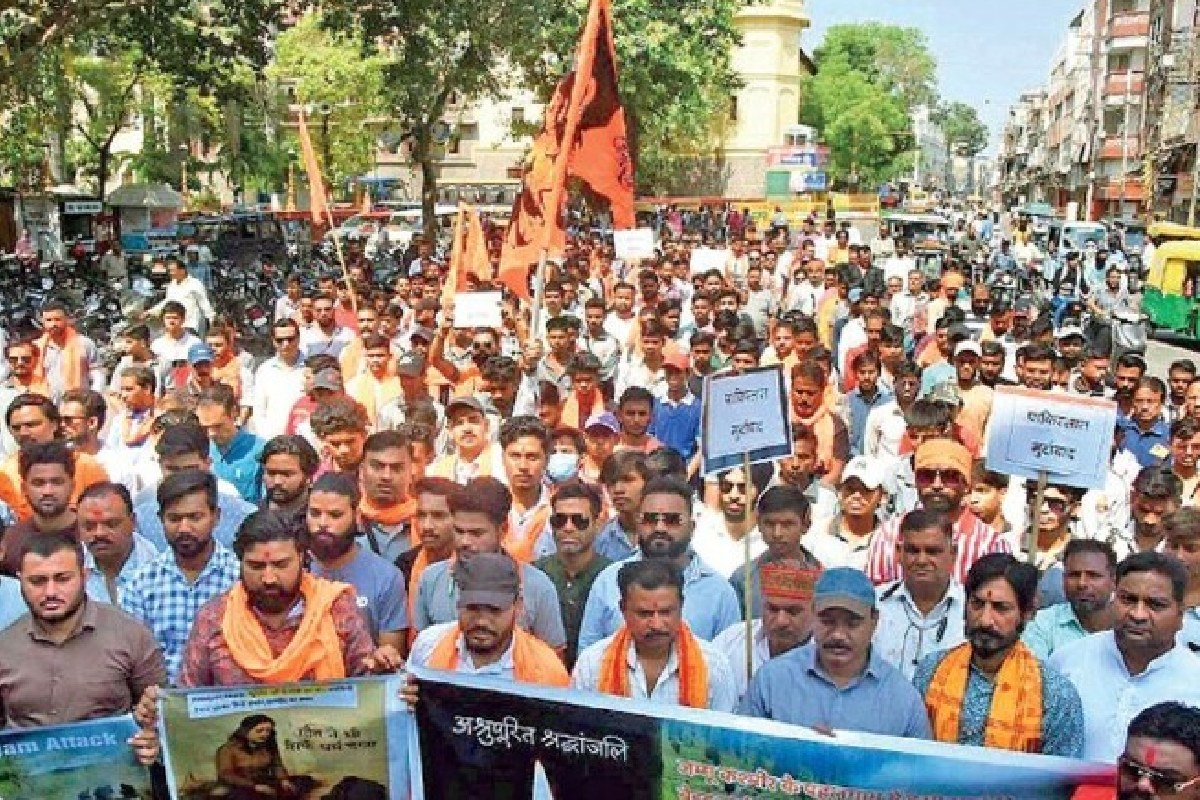 धर्म पूछकर मौत के घाट उतारने की घटना के विरोध में विहिप ने राजबाड़ा पर प्रदर्शन किया, जिसमें आतंकवाद का पुतला जलाया गया। प्रदर्शन में मालवा प्रांत संगठन मंत्री खगेंद्र भार्गव मौजूद थे। कहना था कि जिहादियों के समर्थकों का बहिष्कार करना चाहिए।