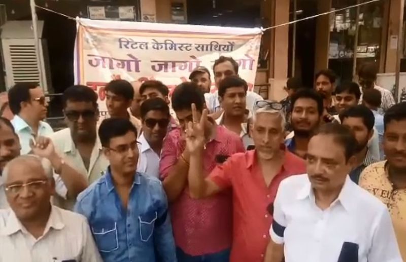दवा बाजार में रिटेल कैमिस्ट व्यापारियों की हड़ताल, रास्ता रोक कर खड़े कहा नहीं खुलने देंगे दवा बाजार