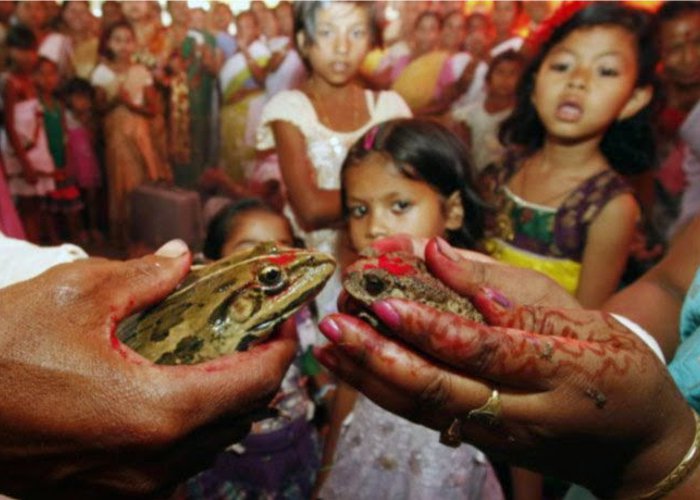 आदिवासी समुदायों में कुछ अजीबो गरीब परंपाए हैं जिन्हे जानकर आपको हैरानी होगी साथ ही आप सोच में पड़ जाएंगे कि ये कैसे संभव है। यहां पूरा समाज एकजुट होकर मेंढकों की शादी करवाता है। पूरे रीति रिवाजों के साथ समुदाय इकट्ठा होता है और शादी की हर रस्म अदा की जाती है। मेंढक को दूल्हा और मेंढ़की को दुल्हन बनाया जाता है।