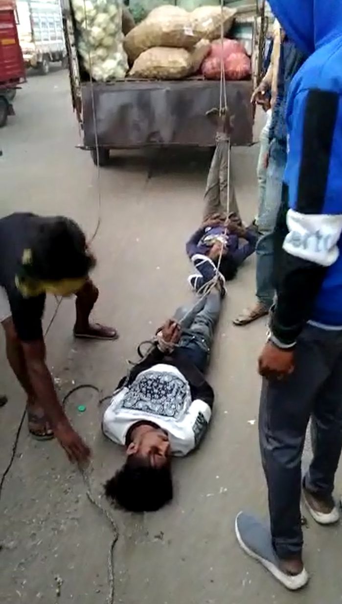 इंदौर की चोइथराम मंडी में शहर तो ठीक आस पास के जिलों से भी व्यापारी माल खरीदने आते हैं तो किसान बेचने को आते हैं। यहां पर कई दिनों से चोरी की घटनाएं सामने आ रही थीं, जिसको लेकर व्यापारियों ने राजेंद्र नगर थाने पर कई शिकायतें भी दर्ज कराई थी। आज सुबह मंडी के बाहरी हिस्से में जहां पर लोडिंग वाहन खड़े होते हैं, जिनमें खरीदा गया सामान व्यापारी रखता है। वहां काटकूट से आए एक व्यापारी की जेब से रुपए निकाल लिए। अचानक व्यापारी का ध्यान इस ओर गया और उसने हरकत करने वाले युवकों को मौके पर ही पकड़ लिया। शोर मचाने पर आसपास खड़े हम्माल और व्यापारी, किसान वहां इकट्ठा हो गए। उन्होंने पहले तो युवकों की जमकर धुनाई की। वे इतने आक्रोशित थे कि बाद में लोडिंग में लगने वाली रस्सी से दोनों युवकों के पैरों को बांध दिया। गुस्से में उन्हें कुछ दूर घसीटा भी गया। यह घटना देखकर मौजूद लोग डर भी गए। इस बात का हल्ला इतनी तेजी से हुआ कि मंडी के सुरक्षाकर्मी मौके पर पहुंच गए और उन्होंने तुरंत पुलिस को सूचना दे दी। कुछ ही देर में पुलिस भी पहुंच गई। युवकों को गाड़ी में बैठाया गया और जिसकी जेब कटी थी, उस व्यापारी को भी राजेंद्र नगर थाने लाया गया। पहले तो पुलिस फरियादी की रिपोर्ट पर युवकों के खिलाफ मुकदमा दर्ज करने की तैयारी कर रही थी लेकिन बाद में जब वीडियो वायरल हुआ तो अब हरकत करने वालों के खिलाफ भी मुकदमा दर्ज किया जा रहा है। इधर घायल युवकों को पुलिस उपचार के लिए बड़े अस्पताल ले गई। युवकों के सिर और पीठ पर गंभीर चोट भी आई है। एक युवक घटना के दौरान बेहोश भी हो गया था। मंडी सुरक्षा अधिकारी सुरेश सिंह ठाकुर ने बताया कि युवक को जेब काटते पकड़ा था तथा वे वाहन में से सब्जियां भी चुरा रहे थे।
