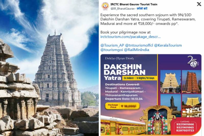 Bharat Gaurav Tourist Train: तीर्थ यात्रियों के लिए इंडियन रेलवे कैटरिंग एंड टूरिज्म कॉरपोरेशन लिमिटेड (IRCTC) द्वारा भारत गौरव पर्यटक ट्रेन (Bharat Gaurav Tourist Train) का संचालन किया जा रहा है। जो इंदौर शहर से दक्षिण दर्शन यात्रा के लिए रवाना होगी। यह ट्रेन मध्यप्रदेश के इंदौर, देवास, उज्जैन, शुजालपुर, सीहोर, संत हिरदाराम नगर, रानी कमलापति, इटारसी, बैतूल स्टेशनों से होते हुए जाएगी। जहां से यात्री इस ट्रेन पर सवार हो सकेंगे।