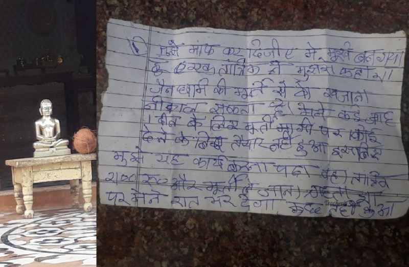 मूर्ति के साथ मिले पत्र में लिखा था, मुझे माफ कर दीजिए मैं मूर्ख बन गया हूं। एक तांत्रिक ने मुझसे कहा था, जैन धर्म की मूर्ति से ही खजाना निकाल सकता है। एक दिन के लिए कई जगह मूर्ति मांगी, लेकिन कोई देने तैयार नहीं हुआ, इसलिए मुझे यह कदम उठाना पड़ा। वह तांत्रिक 2100 रुपए और मूर्ति ले जाना चाहता था। खजाने के लालच में रात भर जागता रहा, लेकिन कुछ नहीं हुआ। जैसे ही सोने लगा तो तांत्रिक मूर्ति लेकर भागने लगा, जिसे पकडऩे दौड़ा तो वह मूर्ति छोडकऱ भाग गया। मैंने सोचा था, सोने का खजाना मिल जाने के बाद कुछ जेवर और मूर्ति रख दूंगा, लेकिन कुछ नहीं मिला। गलती हो गई हो तो माफ कर देना।
