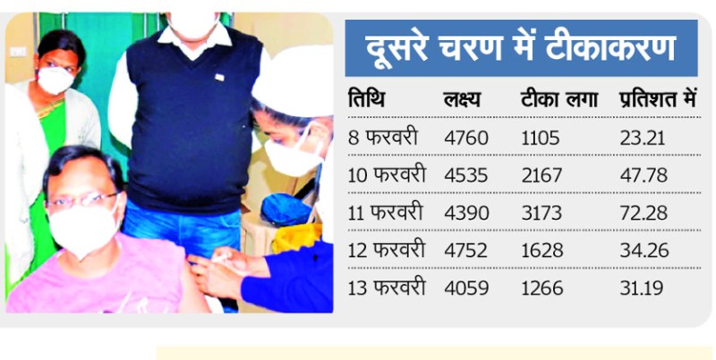 स्वास्थ्य विभाग के अनुसार फ्रंटलाइन वर्कर को कोरोना टीका लगाने के लिए कोविन पोर्टल पर पंजीयन जारी है। इसे देखते हुए सोमवार और बुधवार को भी दूसरे चरण का टीकाकरण कार्यक्रम जारी रहेगा। पंजीकृत फ्रंट लाइन वर्करी को निर्धारित केन्द्र में वैक्सीन लगाई जाएगी। 19 फरवरी को फ्रंटलाइन वर्कर और 20 फरवरी को हेल्थ वर्कर के लिए वैक्सीनेशन का मॉपअप राउंड होगा।