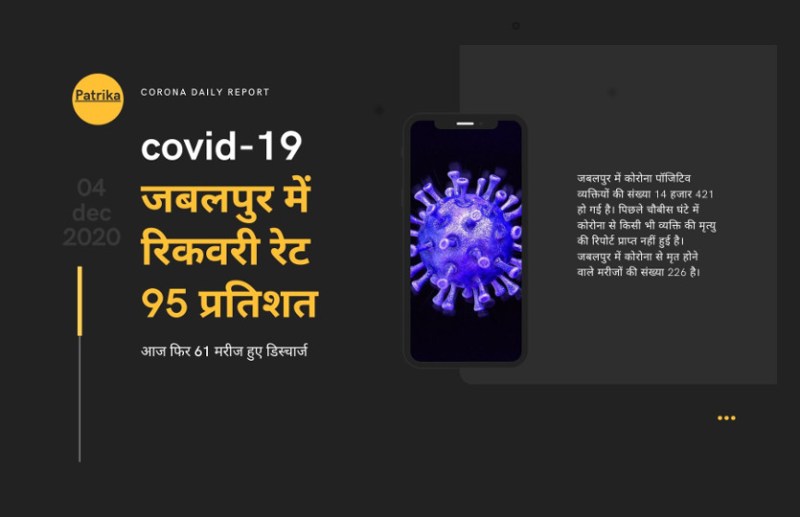 शुक्रवार को प्राप्त हुई जानकारी के अनुसार जबलपुर में कोरोना से स्वस्थ होने पर शुक्रवार को 61 व्यक्तियों को डिस्चार्ज किया गया है। वहीं बीते चौबीस घण्टे के दौरान मिली 1 हजार 473 सेम्पल की परीक्षण रिपोट्र्स में कोरोना के 53 नये मरीज सामने आये हैं। डिस्चार्ज हुये 61 व्यक्तियों को मिलाकर जबलपुर में कोरोना संक्रमण से मुक्त होने वाले मरीजों की संख्या 13 हजार 694 हो गई है और रिकवरी रेट बढकऱ 94.95 प्रतिशत हो गया है। गुरुवार की शाम 6 बजे से आज शुक्रवार की शाम 6 बजे के दौरान आये 53 कोरोना संक्रमितों को मिलाकर जबलपुर में कोरोना पॉजिटिव व्यक्तियों की संख्या 14 हजार 421 हो गई है। पिछले चौबीस घंटे में कोरोना से किसी भी व्यक्ति की मृत्यु की रिपोर्ट प्राप्त नहीं हुई है। जबलपुर में कोरोना से मृत होने वाले मरीजों की संख्या 226 है। जबलपुर में कोरोना के एक्टिव केस अब 501 रह गये हैं। आज कोरोना टेस्ट के लिए 1 हजार 550 व्यक्तियों के सेम्पल लिये गये हैं।