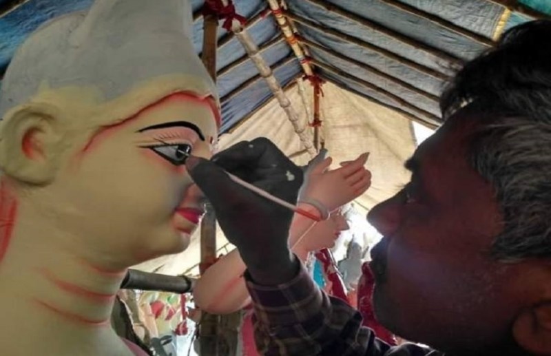 मां दुर्गा प्रतिमा को संवारता मूर्तिकार
