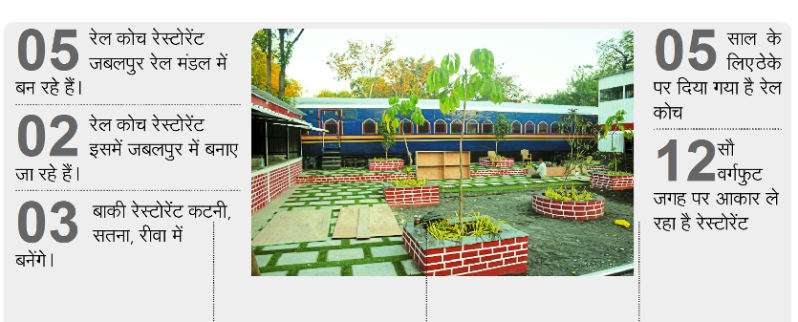जबलपुर रेल मंडल ने चार रेलवे स्टेशन में पांच रेस्टोरेंट के लिए रेल कोच और जगह को लीज पर निजी हाथों में दिया है। मुख्य स्टेशन, मदन महल के अलावा मुड़वारा (कटनी), सतना और रीवा में रेल कोच बनना है। इनसे पांच साल में कुल 3.33 करोड़ रुपए का राजस्व मिलेगा।