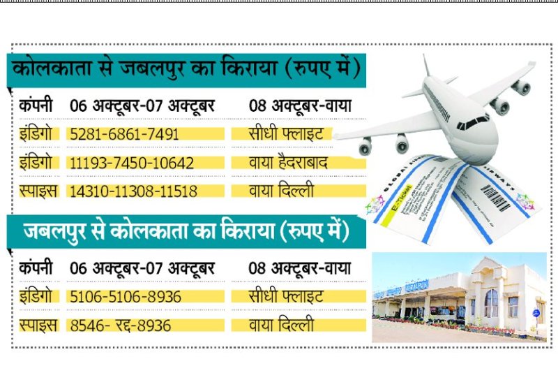 दशहरा में जबलपुर से कोलकाता तक का हवाई सफर महंगा हो गया है। दशहरा व उसके एक दिन पहले और एक दिन बाद एयर फेयर में उछाल आ गया है। इस रूट पर केवल एक सीधी फ्लाइट है। इंडिगो की जबलपुर से कोलकाता की यात्रा महंगी पड़ेगी। स्पाइस ने कोलकाता से जबलपुर के लिए अपनी दो और जबलपुर से कोलकाता के लिए एक उड़ान रखी है, लेकिन यह उड़ान वाया दिल्ली होकर आ जा रही है। दशहरा में शहर के काफी लोग कोलकाता जाते हैं। जाने में तो कम फेयर चुकाना होगा, लेकिन वहां से आना काफी महंगा होगा। जानकारों की माने तो, अधिकतर लोगों ने इंडिगो में बुकिंग कर ली है। यात्री अधिक होने पर इंडिगो ने वाया हैदराबाद से जबलपुर तक का सफर भी कराने का ऑप्शन रखा गया है। कुछ समय पूर्व तक स्पाइस जेट की ओर से जबलपुर कोलकाता जबलपुर फ्लाइट संचालित की जाती थी। लेकिन स्पाइस प्रबंधन ने इसे बंद कर दिया। जिसके बाद इंडिगो ने अपना विमान इस रूट पर उतारा। इस रूट में यात्री संख्या में इजाफा हुआ, तो स्पाइस ने भी अपनी सेवाएं वाया दिल्ली शुरू कर दीं।