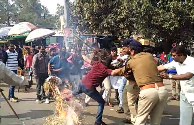 सिहोरा। भोपाल में सीएम निवास पर सोमवार को शांतिपूर्ण तरीके से आंदोलन कर रहे कांग्रेसी नेताओं पर लाठीचार्ज के विरोध में मंगलवार को युवक कांग्रेस नेताओं ने सिहोरा बस स्टैंड में सीएम का पुतला फूंका। साथ ही मुख्य्मंत्री के खिलाफ जमकर नारेबाजी की। पुतला दहन के दौरान पुलिस और कांग्रेसी नेताओं के बीच हल्की सी झड़प भी हुई, लेकिन आक्रोशित नेताओं में धक्का- मुक्की के बीच सीएम का पुतला फूंक डाला।