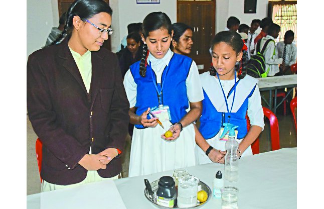 आमाहिनौता स्कूल से आई अनामिका दुबे ने प्रैक्टिकल के जरिए दिखाया कि एक कागज पर एनएओएच के घोल से कुछ भी लिखा जाए और उस पर फिनाफ्थलीन को स्प्रे किया जाए तो कागज पर गुलाबी रंग में कहानी नजर आने लगती है।