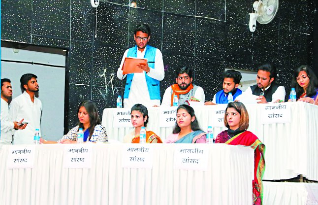 युवा संसद मंचन में २० स्टूडेंट्स शामिल हुए। स्पीकर की भूमिका पल्लवी घोष ने निभाई। रूलिंग पार्टी में सांसदों की भूमिका अस्तुत कुररारिया, अदिति तिवारी, पलक बंसल, साक्षी अडाना, हर्षद शर्मा, रश्मि मिश्रा, शुभम जैन, पलक श्रीवास, अनुज जैन ने निभाई। विपक्ष की भूमिका में आरती यादव, आकृति, उर्वशी मोटवानी, अंकित बोहरे, हर्षवर्धन सिसोदिया, मासूम जैन, प्रांजल, आयुषी, आदीश्वर, ऋषभ रहे।