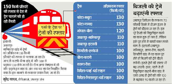 जबलपुर में जोन मुख्यालय होने के बावजूद जबलपुर डिवीजन में सबसे धीमी गति से टे्रनें चल रही हैं। इसके अधिकतर सेक्शन 100 की चाल से आगे नहीं बढ़ पाए हैं। मालखेड़ी-कटनी, सिंगरौली-कटनी, रीवा-सतना में अधिकतम सौ किमी प्रतिघंटे की गति से टे्रनें चल रही हैं। जबलपुर-इटारसी तथा जबलपुर-मानिकपुर के बीच कागजों में टे्रनों की गति 110 किमी प्रतिघंटे है, लेकिन 50 से अधिक परमानेंट व टेम्परेरी कॉशन ऑर्डर के अवरोधों के चलते 90 से ज्यादा की तेजी नहीं पकड़ रहीं।