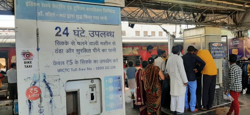 - रेलवे स्टेशन के प्लेटफॉर्म नंबर तीन-चार पर पटना सुपर आई थी। यहां वॉटर वेंडिंग मशीन बंद पड़ी थी। मशीन के बाजू में लगे पेयजल के नल पर भीड़ हो गई थी, ऐसे में यात्री नल को छोडकऱ पास ही कैंटीन से पानी की बोतल खरीद रहे थे।