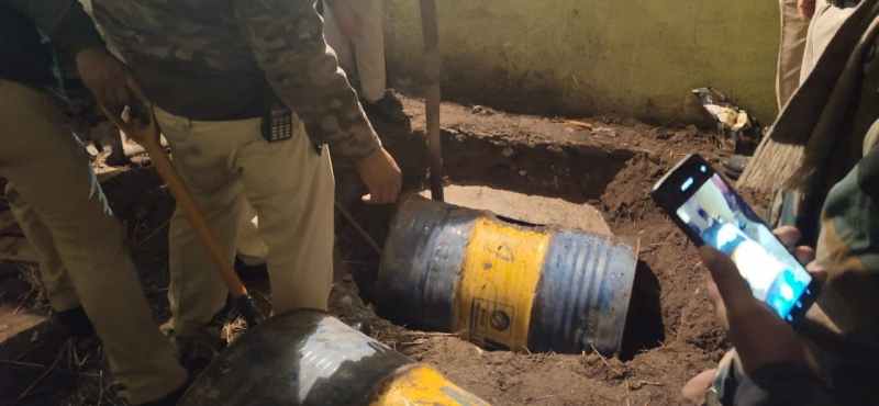 फर्श के नीचे गाड़े लाहन से भरे 8 ड्रम