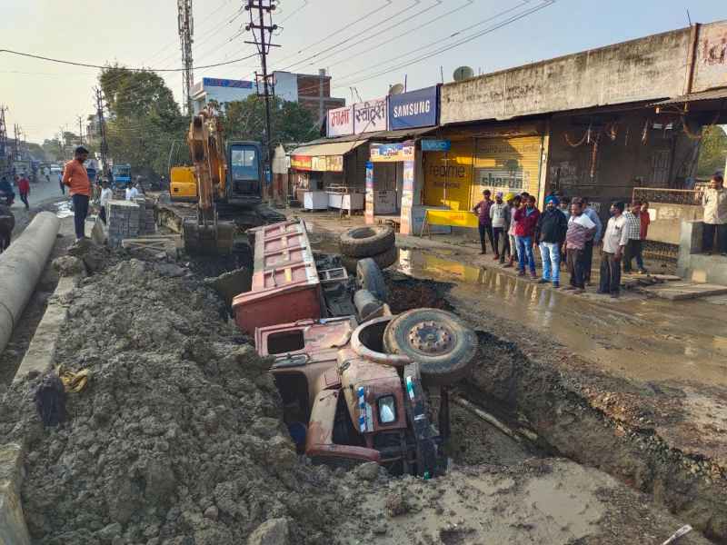 जबलपुर। सीवर लाइन बिछाने का काम जबलपुर में कितने नकारे तरीके से हो रहा है, इसका अंदाजा सीवर के गड्ढे में समाए डम्पर को देखकर लगाया जा सकता है। जबलपुर के मदन महल चौराहा से आमनपुर मार्ग पर सीवर लाइन बिछाने खोदे गए गड्ढे में पूरा डम्पर समाने वाली तस्वीर देखकर आम लोगों को गुस्सा सातवें आसमान पर पहुंच गया। दरअसल जमीन को गहराई तक खोदा गया है, आसपास मिट्टी का ढेर लगा है, ठेकेदार का डम्पर वहां से मिट्टी भरकर ले जाने के लिए लगाया गया था। इसी दौरान जमीन धंसकने डम्पर पलटकर गड्ढे में समा गया। डम्पर चालक को गंभीर चोट आई हंै। उसे इलाज के लिए अस्पताल में भर्ती कराया गया है। निर्माण साइट पर सुरक्षा के लिए आवश्यक इंतजाम नहीं किए गए हैं।