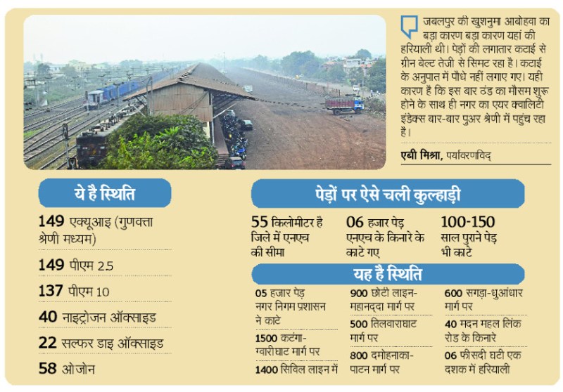 जबलपुर। शहर की खुशनुमा आबोहवा के लिए देशभर में अलग पहचान रखने वाले जबलपुर को नजर लग गई है। वायु प्रदूषण लगातार बढऩे के कारण यह चर्चा आम हो रही है। दरअसल, दीपावली के एक दिन बाद एयर क्वालिटी इंडेक्स सामान्य स्तर पर आ गया था, लेकिन उसके बाद के दिनों में कई बार एक्यूआई पुअर श्रेणी में पहुंचा। कोरोना संकट के बीच इसे खतरनाक माना जा रहा है।विशेषज्ञों के अनुसार नगर में वायु प्रदूषण का स्तर बढऩे का बड़ा कारण ग्रीन बेल्ट का तेजी से सिमटना है। पिछले एक दशक में नगर सहित बायपास के किनारे के दशकों पुराने पेड़ों पर जमकर कुल्हाड़ी चली। जिस अनुपात में पेड़ काटे गए, उस अनुपात में पौधरोपण नहीं किया गया।
