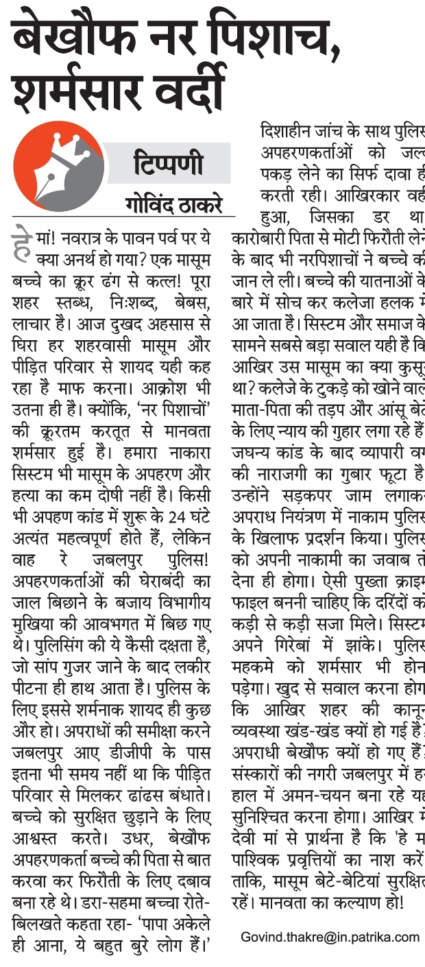 हे मां! नवरात्र के पावन पर्व पर ये क्या अनर्थ हो गया? एक मासूम बच्चे का क्रूर ढंग से कत्ल! पूरा शहर स्तब्ध, नि:शब्द, बेबस, लाचार है। आज दुखद अहसास से घिरा हर शहरी मासूम और पीडि़त परिवार से शायद यही कह रहा है माफ करना। आक्रोश भी उतना ही है। क्योंकि, 'नर पिशाचोंÓ की क्रूरतम करतूत से मानवता शर्मसार हुई है। हमारा नाकारा सिस्टम भी मासूम के अपहरण और हत्या का कम दोषी नहीं है। किसी भी अपहण कांड में शुरू के 24 घंटे अत्यंत महत्वपूर्ण होते हैं, लेकिन वाह रे जबलपुर पुलिस! अपहरणकर्ताओं की घेराबंदी का जाल बिछाने के बजाय विभागीय मुखिया की आवभगत में बिछ गए थे। पुलिसिंग की ये कैसी दक्षता है, जो सांप गुजर जाने के बाद लकीर पीटना ही हाथ आता है। पुलिस के लिए इससे शर्मनाक शायद ही कुछ और हो। अपराधों की समीक्षा करने जबलपुर आए डीजीपी के पास इतना भी समय नहीं था कि पीडि़त परिवार से मिलकर ढांढस बंधाते। बच्चे को सुरक्षित छुड़ाने के लिए आश्वस्त करते। उधर, बेखौफ अपहरणकर्ता बच्चे की पिता से बात करवा कर फिरौती के लिए दबाव बना रहे थे। डरा-सहमा बच्चा रोते-बिलखते कहता रहा-'पापा अकेले ही आना, ये बहुत बुरे लोग हैं।Ó दिशाहीन जांच के साथ पुलिस अपहरणकर्ताओं को जल्द पकड़ लेने का सिर्फ दावा ही करती रही। आखिरकार वही हुआ, जिसका डर था। कारोबारी पिता से मोटी फिरौती लेने के बाद भी नरपिशाचों ने बच्चे की जान ले ली। बच्चे की यातनाओं के बारे में सोच कर कलेजा हलक में आ जाता है। सिस्टम और समाज के सामने सबसे बड़ा सवाल यही है कि आखिर उस मासूम का क्या कुसूर था? कलेजे के टुकड़े को खोने वाले माता-पिता की तड़प और आंसू बेटे के लिए न्याय की गुहार लगा रहे हैं। जघन्य कांड के बाद व्यापारी वर्ग की नाराजगी का गुबार फूटा है। उन्होंने सड़कपर जाम लगाकर अपराध नियंत्रण में नाकाम पुलिस के खिलाफ प्रदर्शन किया। पुलिस को अपनी नाकामी का जवाब तो देना ही होगा। ऐसी पुख्ता क्राइम फाइल बननी चाहिए कि दरिंदों को कड़ी से कड़ी सजा मिले। सिस्टम अपने गिरेबां में झांके। पुलिस महकमे को शर्मसार भी होना पड़ेगा। खुद से सवाल करना होगा कि आखिर शहर की कानून व्यवस्था खंड-खंड क्यों हो गई है? अपराधी बेखौफ क्यों हो गए हैं? संस्कारों की नगरी जबलपुर में हर हाल में अमन-चयन बना रहे यह सुनिश्चित करना होगा। आखिर में देवी मां से प्रार्थना है कि 'हे मां पाश्विक प्रवृत्तियों का नाश करें। ताकि, मासूम बेटे-बेटियां सुरक्षित रहें। मानवता का कल्याण हो!