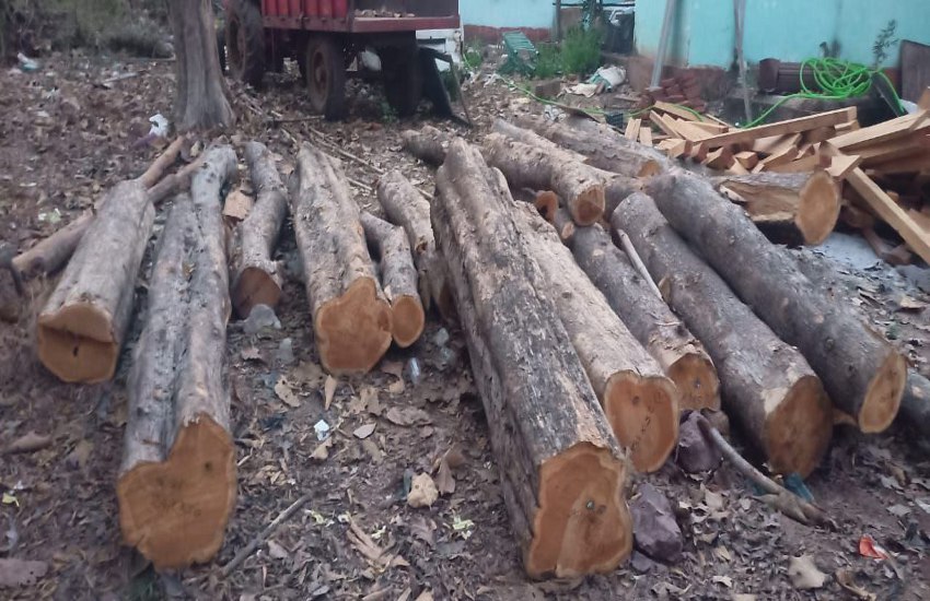 वन विभाग की कार्रवाई के दौरान पकड़े गए सागौन के गोले। मिल के बाहर से जब्त चिरान।