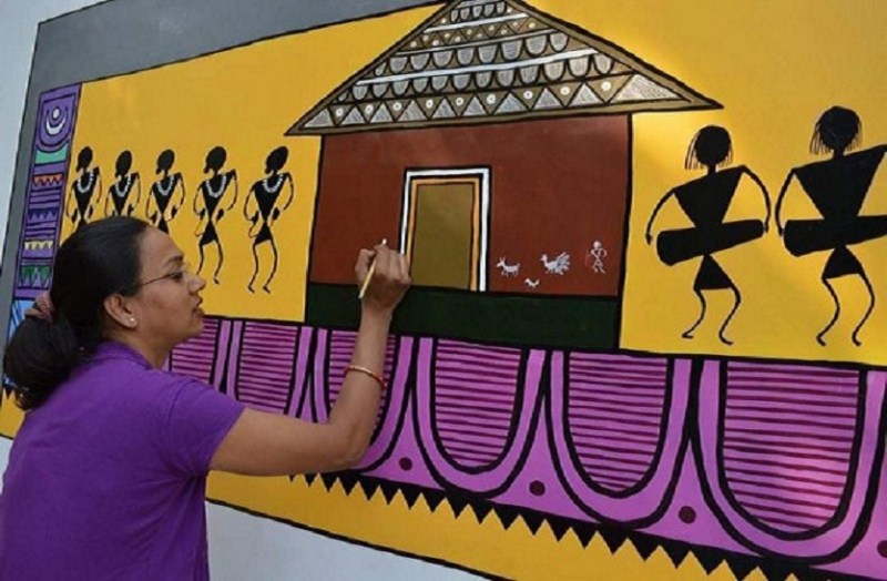 लोक भित्ति चित्र कला पर प्रशिक्षण दे रही हैं
