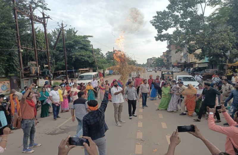 निगम दफ्तर के बाहर आयुक्त का पुतला फूंकते सक्षम के कार्यकर्ता