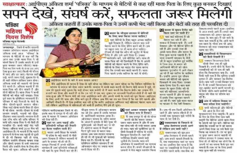 जगदलपुर. आईपीएस अंकिता कहती हैं मेरे माता-पिता की तीन संतानें थीं और तीनों बेटियां थीं। माता-पिता ने कभी बेटियों को बोझ नहीं समझा। पिता दुर्ग शहर के प्रतिष्ठित व्यवसायी थे। परिवार में बड़े पिताजी के बेटों के बीच खेलते-कूदते बचपन बीता। जैसा भाई खेला करते वैसा ही खेल मैं भी खेला करती। दीवार से ऊंची छलांग लगाती, भाइयोंको दौड़ा-दौड़ा कर थका डालती। बचपन से ही एक टॉम बॉय की छवि परिवार में बनी रही। माता-पिता ने भी वैसी ही परवरिश दी। कभी कोई भेद नहीं किया। अंकिता शर्मा २०१८ बैच की आईपीएस हैं। वे बताती हैं कि पहले प्रयास में वे मेन्स तक पहुंची तो दूसरे में प्री भी क्लियर नहीं हो पाया, लेकिन उन्होंने हौसला बनाए रखा और तीसरे प्रयास में उन्हें सफलता मिली और उन्होंने सेवा के लिए होम कैडर को चुना। अंकिता की पहली पोस्टिंग बलौदाबाजार जिले में थी। इसके बाद वे रायपुर में भी रहीं और अब वे बस्तर में नक्सल ऑपरेशन को देख रही हैं।