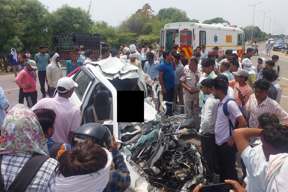 ट्रक से टक्कर के बाद कार के उड़े परखच्चे (फोटो: पत्रिका)