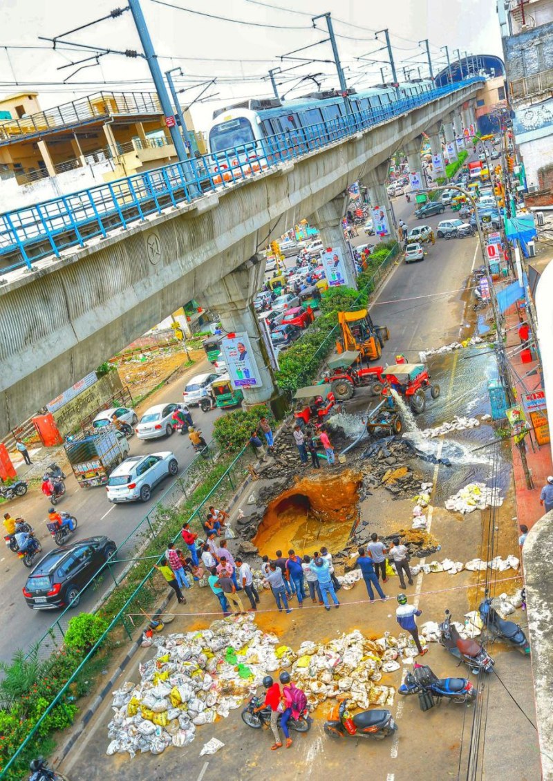 फिर धंसी सड़क, परत हटाई तो निकला नाकामी का 20 फीट गहरा गड्ढा