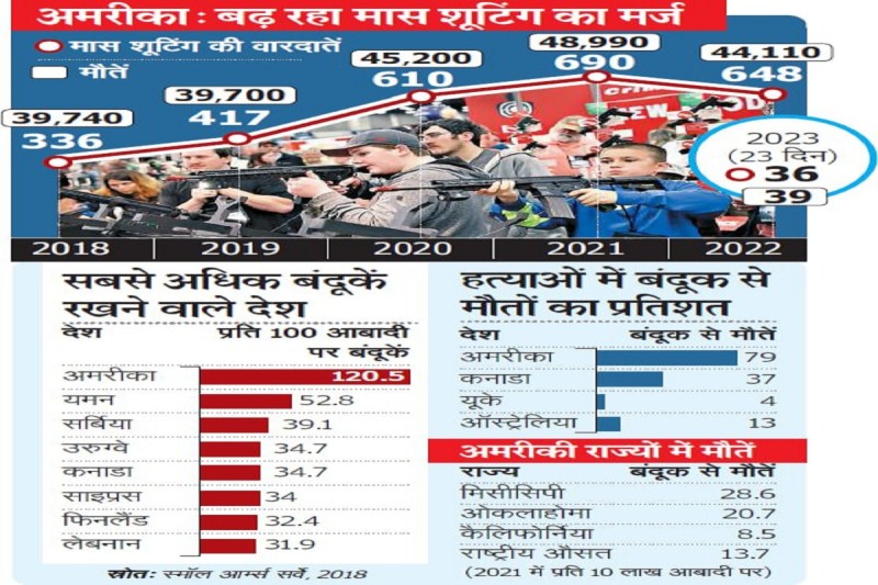 कैलिफोर्निया के मोंटेरी पार्क शहर के एक क्लब व डांस स्टूडियो में शनिवार रात गोली मारकर की गई 10 लोगों की हत्याओं के बाद अमरीका में सभी संघीय कार्यालयों पर राष्ट्रीय ध्वज आधा झुका दिया गया है। साल 2023 के 23 दिनों में ही गोली मारकर सामूहिक हत्याओं के अब तक 36 मामले सामने आ चुके हैं, जिसमें 39 मौतें हुई हैं। मोंटेरी हत्याकांड के अगले ही दिन लुइसियाना के बैटन रूज नाइट क्लब में एक और सामूहिक गोलीबारी की वारदात दर्ज की गई, जिसमें एक दर्जन लोग घायल हो गए। पीड़ितों में से एक की हालत नाजुक बनी हुई है।