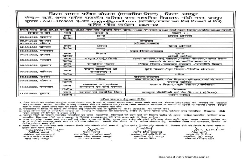 जयपुर जिले की परीक्षा का टाइमटेबल किया जारी