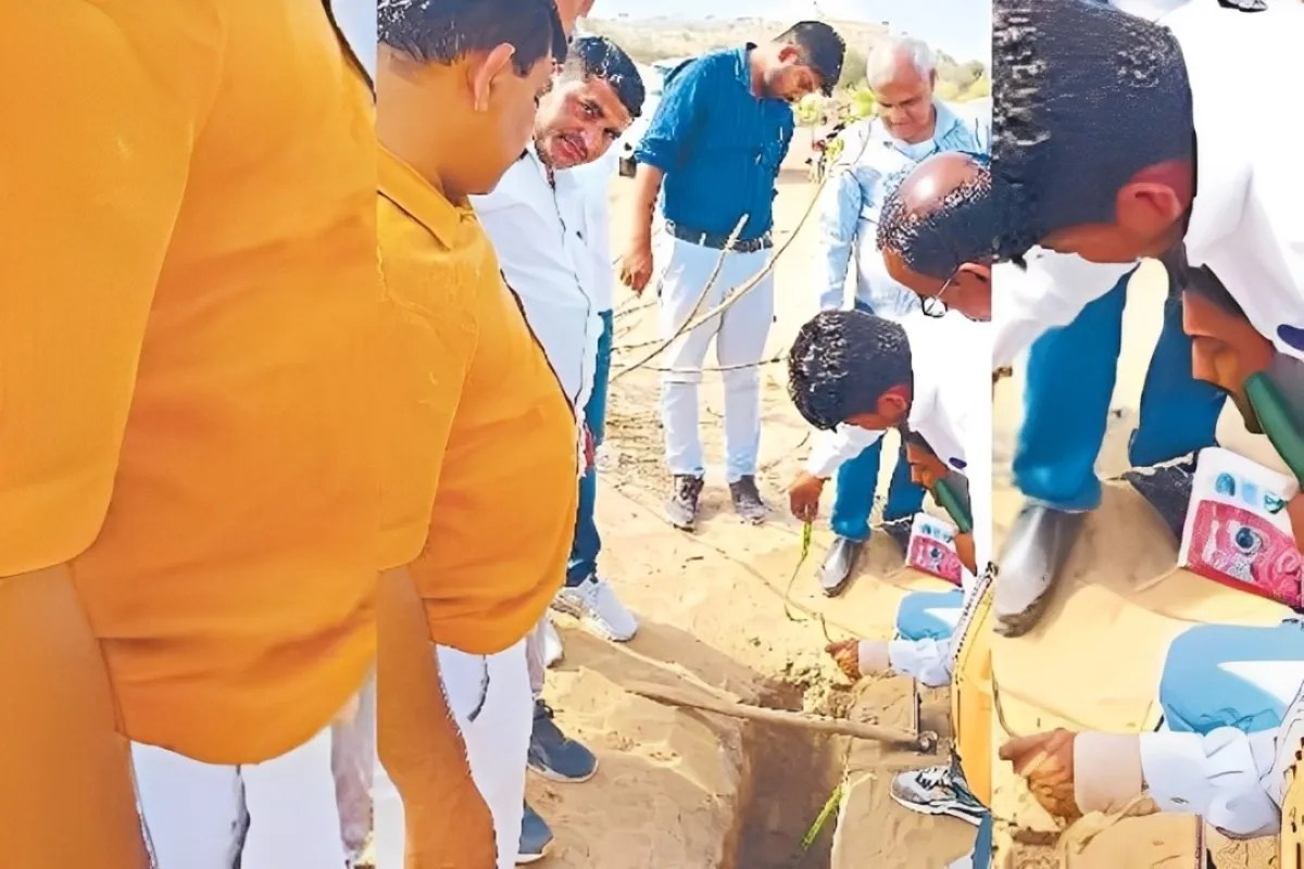 शाहपुरा क्षेत्र में पाइप लाइन बिछाने के लिए गहराई नापते इंजीनियर (फोटो: पत्रिका)