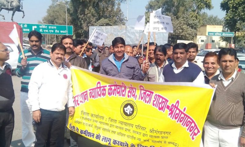 वेतनमान में इजाफा कराने के संबंध में शेट्टी आयोग की सिफारिशों को लागू करने की मांग को लेकर राजस्थान न्यायिक कर्मचारी संघ ने बुधवार को फिर से आंदोलन शुरू कर दिया। पिछले महीने सामूहिक अवकाश पर जाने के निर्णय के उपरांत राजस्थान हाईकोर्ट रजिस्ट्रार और न्यायिक कर्मियों के प्रदेश स्तरीय संगठन पदाधिकारियों के बीच वार्ता होने के कारण दो सप्ताह के लिए आंदोलन स्थगित कर दिया था। लेकिन इस आयोग के संबंध में राज्य सरकार ने अभी हामी नहीं भरी है। संघ के जिला सचिव चन्द्रकांत शर्मा ने बताया कि इस मुद्दे पर रोजाना प्रत्येक तहसील मुख्यालय पर संगठन के पदाधिकारी सांकेतिक प्रदर्शन करेंगे।