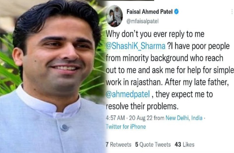दरअसल, शनिवार अल सुबह 4 बजकर 57 मिनट पर फैजल पटेल ने ट्वीट करते हुए लिखा 'मुख्यमंत्री के ओएसडी शशिकांत शर्मा आप मेरा फोन क्यों नहीं उठाते हैं जबकि मेरे पिता के देहांत के बाद राजस्थान के गरीब अल्पसंख्यक वर्ग से जुड़े लोग अपना काम कराने के लिए मुझे फोन करते हैं। मेरे पिता के देहांत के बाद अल्पसंख्यक वर्ग के लोगों को मुझसे उम्मीद रहती है कि मैं उनकी समस्याओं का समाधान करूं लेकिन आप मेरा फोन नहीं उठाते हैं। हालांकि इसके थोड़ी देर के बाद फैजल पटेल ने अपने ट्वीट डिलीट कर दिया।