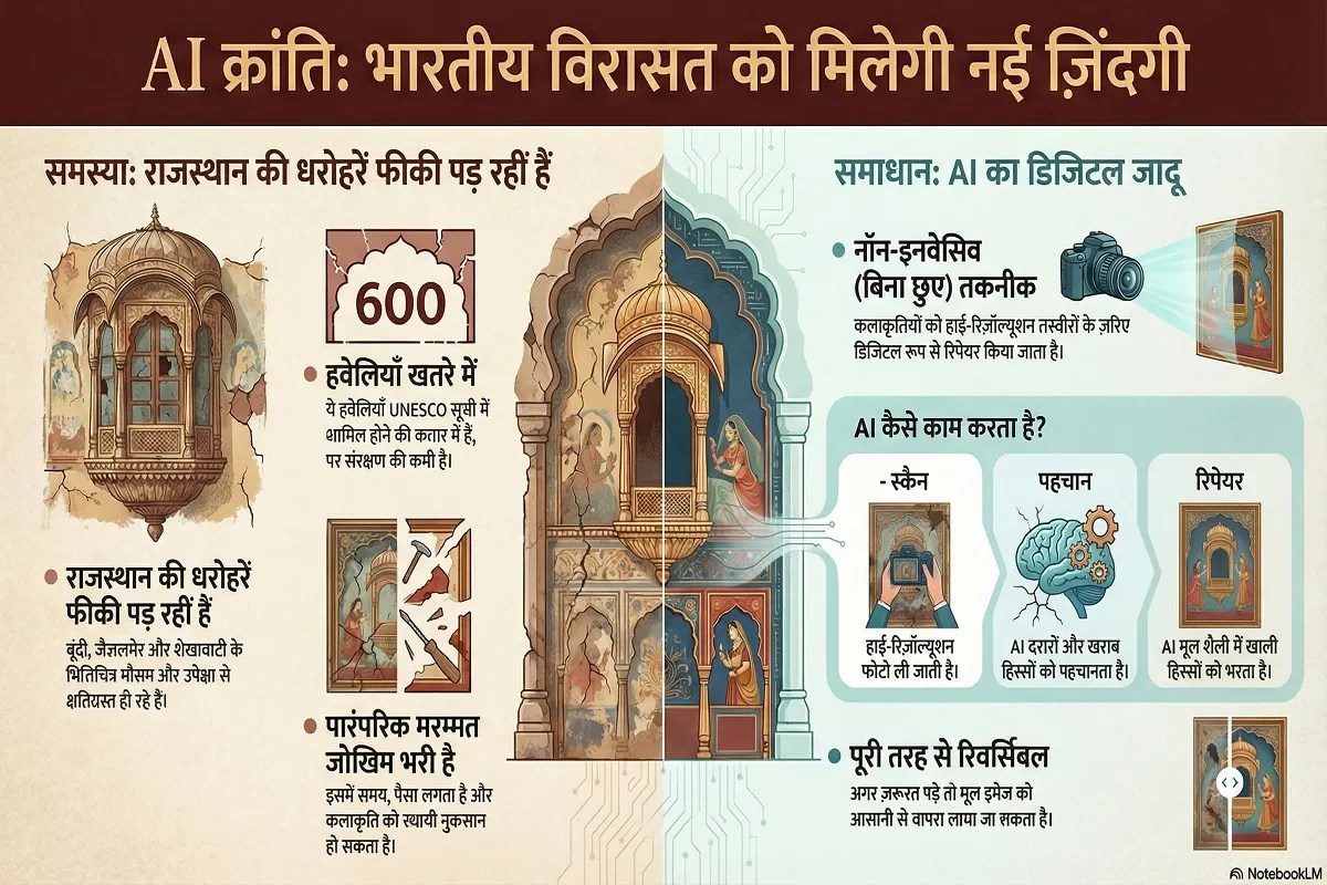 AI Heritage Restoration: जयपुर. हैदराबाद में मल्ला रेड्डी यूनिवर्सिटी के शोधकर्ताओं ने पुरातात्विक वस्तुओं की डिजिटल रेस्टोरेशन के लिए एक क्रांतिकारी AI-आधारित हाइब्रिड डीप लर्निंग इनेबल्ड इमेज इनपेंटिंग फॉर स्मार्ट हिस्टोरिकल आर्टिफैक्ट रेस्टोरेशन विधि विकसित की है। यह तकनीक क्षतिग्रस्त ऐतिहासिक कलाकृतियों, म्यूरल्स (भित्तिचित्रों), पॉटरी (मिट्टी के बर्तन), मूर्तियों और पांडुलिपियों को बिना छुएडिजिटली रिपेयर कर सकती है। यह नॉन-इनवेसिव (गैर-आक्रामक) तरीका म्यूजियमों, संरक्षण टीमों और पुरातत्वविदों के लिए एक बड़ा विकल्प साबित हो रहा है, जहां पारंपरिक रेस्टोरेशन में समय, श्रम और मानवीय त्रुटि का खतरा रहता है। अभी डायरेक्ट AI से हेरिटेज रेस्टोरेशन का कोई एक्टिव प्रोजेक्ट नहीं चल रहा (जैसे म्यूरल्स को AI से रिपेयर), लेकिन डिजिटल प्रिजर्वेशन जारी है, और AI पॉलिसी 2026 से यह क्षेत्र जल्दी एक्सपैंड हो सकता है। आम बातचीत में लोग इसे "एआई इनपेंटिंग तकनीक" या "डिजिटल रेस्टोरेशन AI" भी कहते हैं।